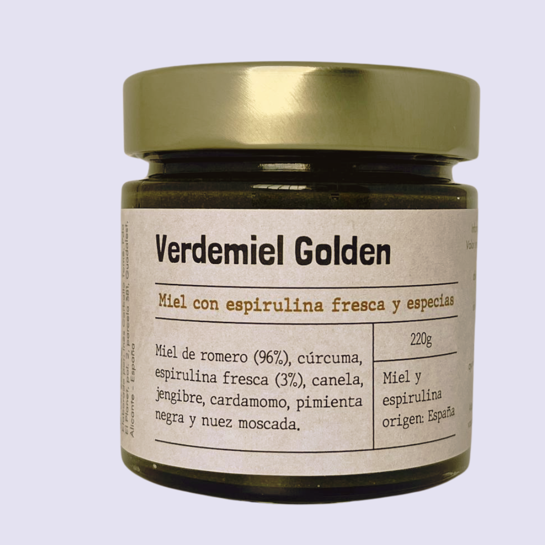 Verdemiel Golden reinventa la tradicional golden milk uniendo la miel cruda de romero, la espirulina fresca y una cuidadosa selección de especias. La cúrcuma, el jengibre y la pimienta negra aportan un efecto antiinflamatorio natural; la canela y el cardamomo ayudan a la digestión; la espirulina fresca y la miel son ricas en antioxidantes; y la bebida templada resulta reconfortante y relajante.